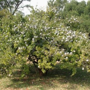 Wild mango / Wilde mangoThis is a tall tree with a flat-topped, widespreading crown. The yellowish-orange flowers resemble an old fashioned powder puff. Elephants love the fruit!